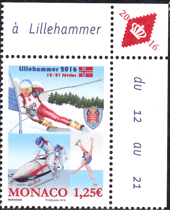 Auf der Marke zu den Olympischen Jugend-Winterspielen 2016 in Lillehammer aus Monaco (MiNr 3276) wird auch ein Zweierbob gezeigt.