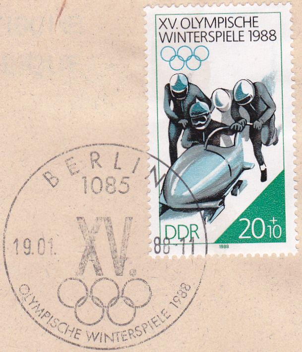 Briefausschnitt mit der Marke zu 20+10Pf aus der DDR (MiNr 3142) mit einem Viererbob beim Anschieben und dem dazu passenden Ersttagsonderstempel Berlin.