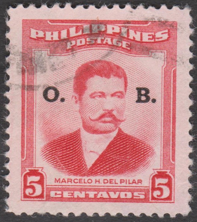 Philippinen Dienstmarke MiNr. 38 erschien am 14.04.1941, indem die Freimarke MiNr. 439 I mit einem Buchdruck-Aufdruck "O. B." versehen wurde.
