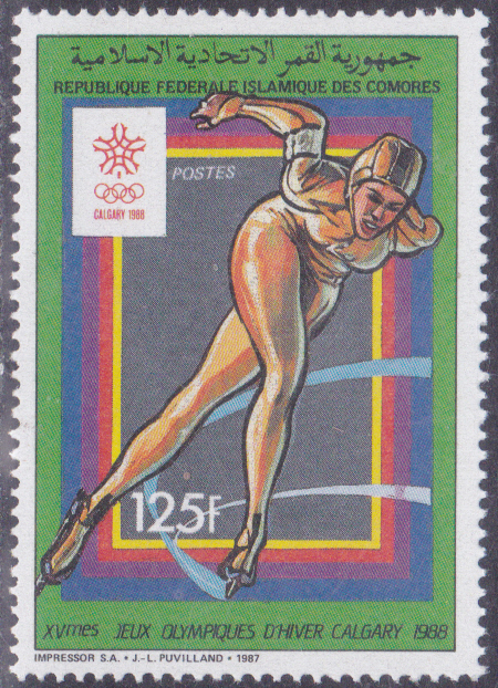 Auf den Komoren ist in einer Serie zu den Winterspielen 1988 diese Marke (MiNr 808 A) mit einer Eisschnellläuferin erschienen.