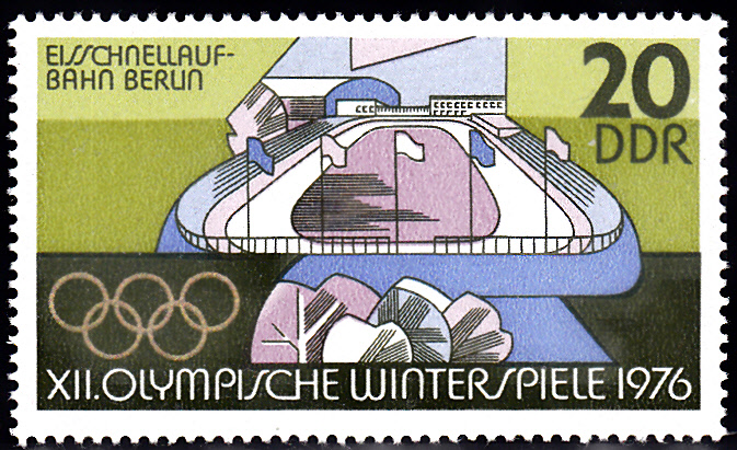 Die Marke zu 20Pf aus der Serie der DDR zu den Winterspielen 1976 (MiNr 2101) zeigt die Eisschnelllaufbahn in Berlin.