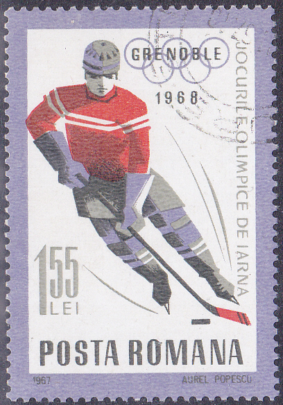 In der Serie aus Rumänien zu den Winterspielen 1968 gibt es auch eine Marke (MiNr 2624) mit einem Eishockeyspieler.