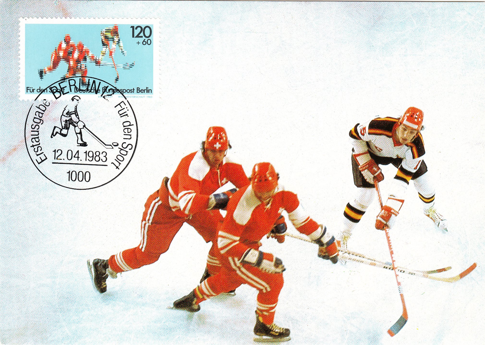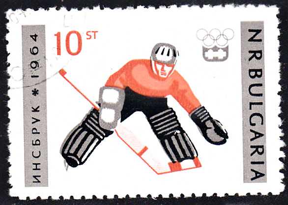 Auf dieser Marke aus Kanada (MiNr 1012) zu den Olympischen Spielen in Calgary 1988 ist bei genauer Betrachtung ein Eishockeyspieler zu erkennen.