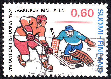 Zur Eishockey Weltmeisterschaften 1974 in Helsinki gab es in Finnland diese Sondermarke (MiNr 745) mit der Abbildung eines Eishockeyspielers vor einem Eishockeytorwart.