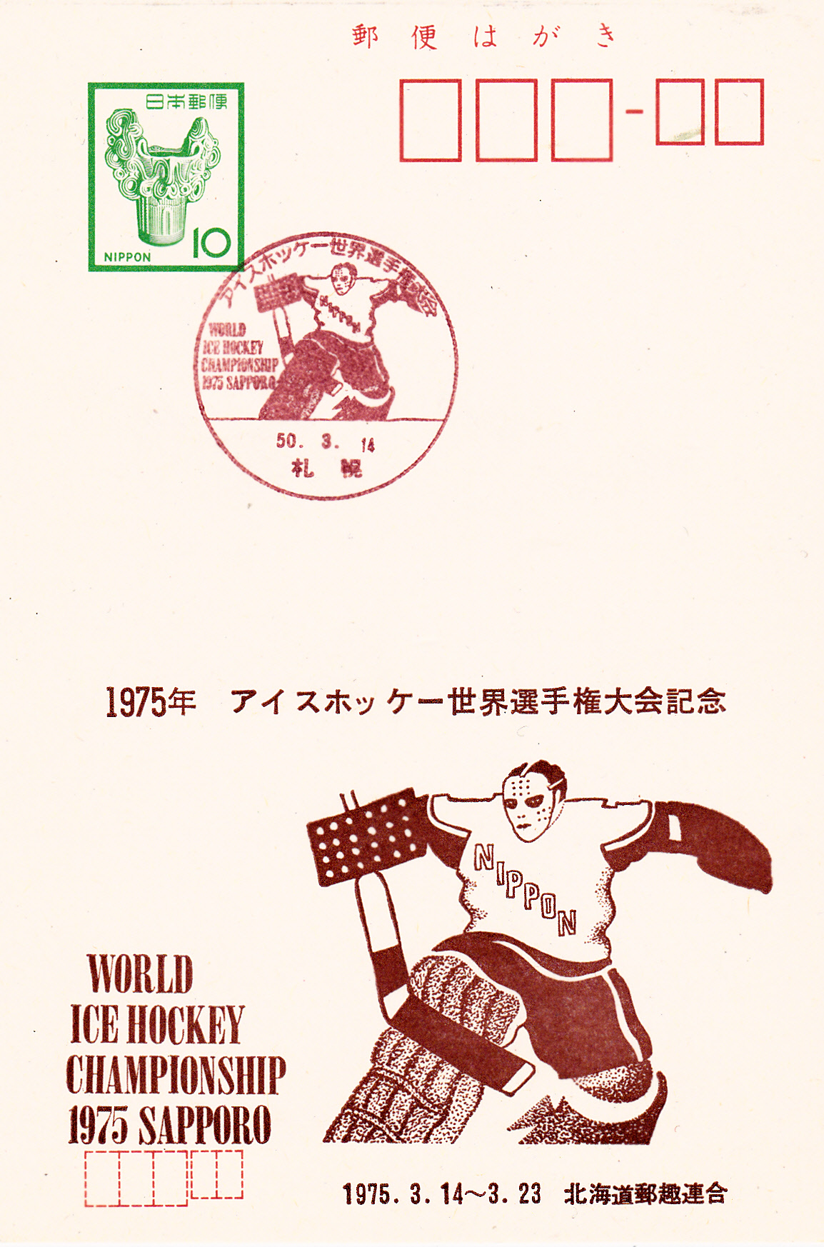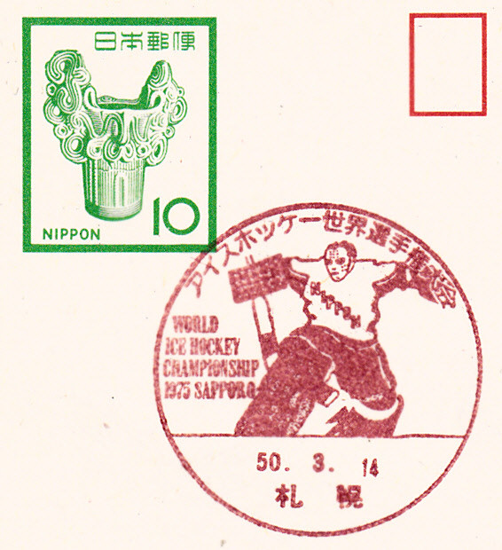 Ganzsache aus Japan mit Sonderstempel zur B-WM im Eishockey. Im Stempelbild eine schöne Abbildung eines Eishockey-Torwart.