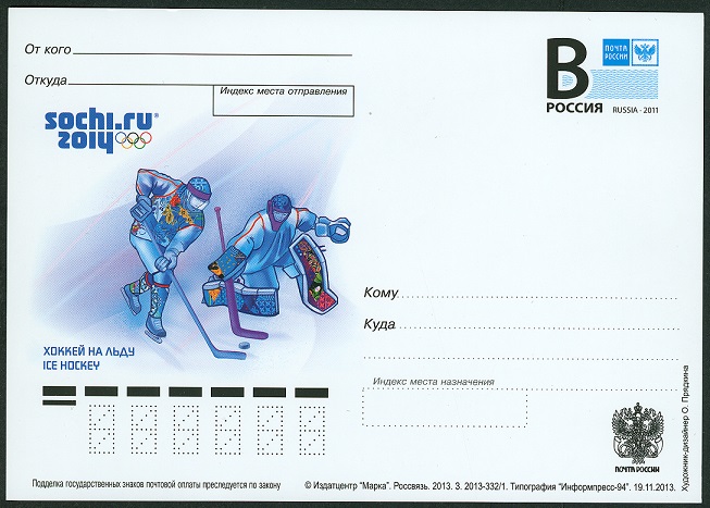 Dem Eishockey widmete die russische Postverwaltung eine Postkarte der Kategorie "B-Post". Sie war im postalischen Gesamtpaket zu den Olympischen Winterspielen im russischen Sotschi enthalten.
