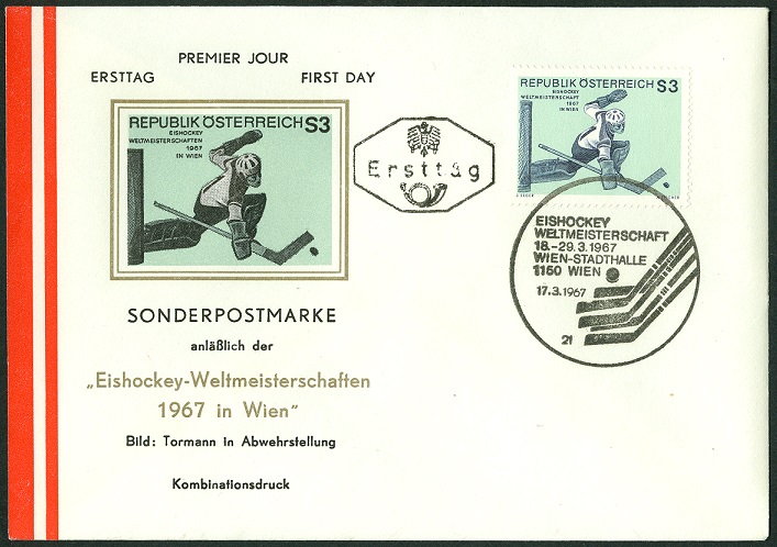 1967 fanden die Eishockey-Weltmeisterschaften in Wien statt. Anlass genug für eine 3 Schilling-Briefmarkenausgabe. Hier auf dem offiziellen Ersttagsbrief.