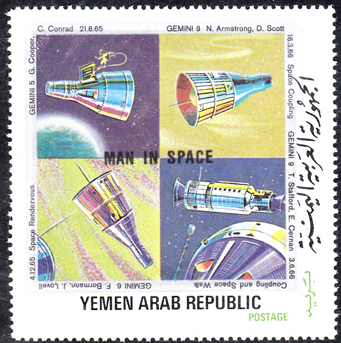 Auf dieser Marke aus der Tschechoslowakei (MiNr 1689) wird im oberen Teil der Marke das Andocken von Gemini an Agena-Zielsatellit dargestellt. Links unten sehen wir Gemini 8 und den Zielsatelliten auf ihren Umlaufbahnen und in der Mitte des Markenbildes die Montage eines fiktiven Raumstationsprojektes.