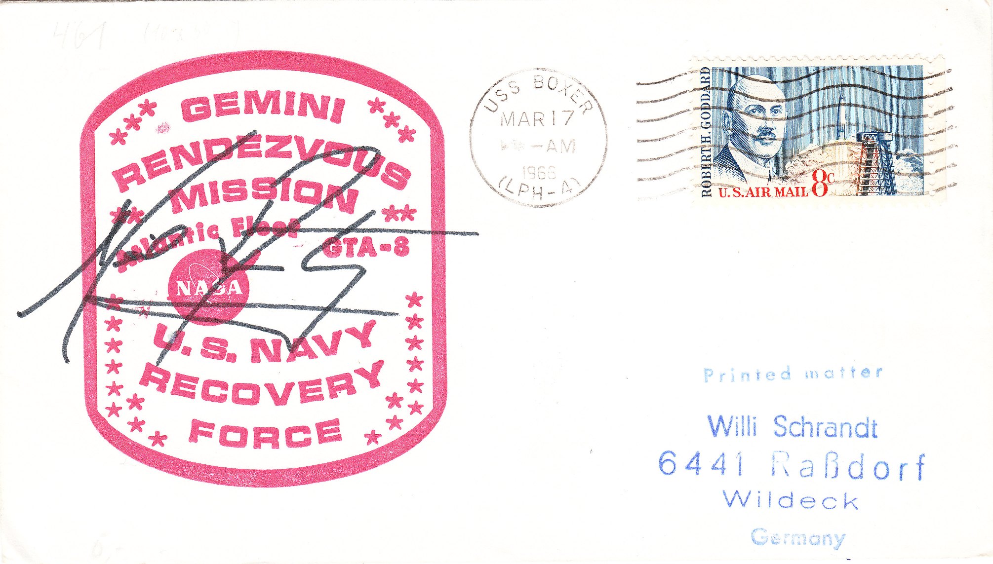 Dieser Beleg dokumentiert per rotem Cachetstempel der Atlantikflotte die Weltraummission GEMINI 8: