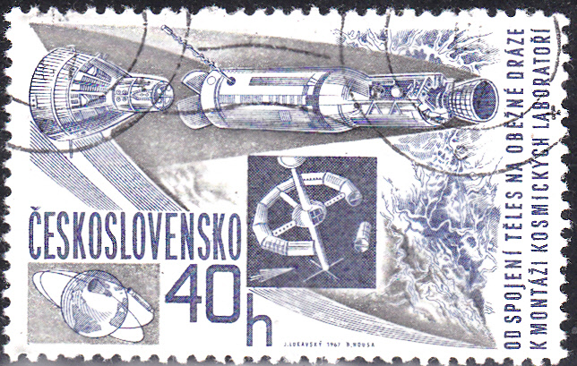 Auf dieser Marke aus der Tschechoslowakei (MiNr 1689) wird im oberen Teil der Marke das Andocken von Gemini an Agena-Zielsatellit dargestellt. Links unten sehen wir Gemini 8 und den Zielsatelliten auf ihren Umlaufbahnen und in der Mitte des Markenbildes die Montage eines fiktiven Raumstationsprojektes.