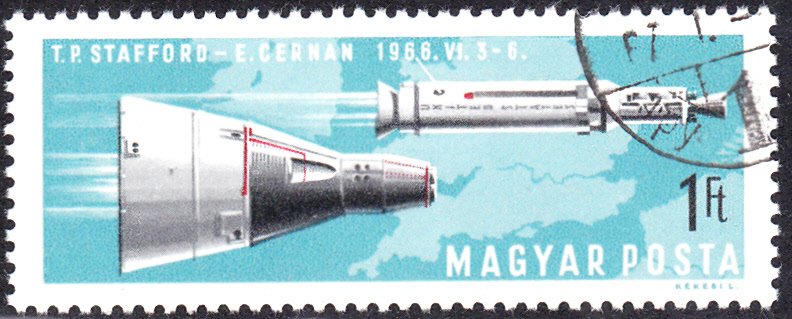 Auf dieser Marke aus Ungarn (MiNr 2302 A) ist die Begegnung des Raumschiffes "Gemini 9" mit dem Zielsateliten dargestellt.