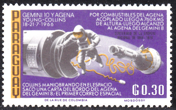 Auf dieser Marke aus Bulgarien (MiNr 1763) wird Gemini 10 beim Andocken mit dem Agena-Zielsatelliten gezeigt.