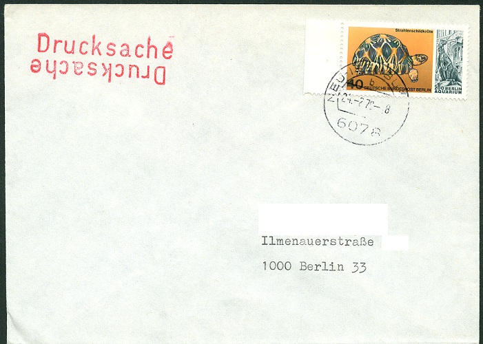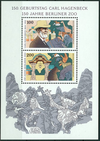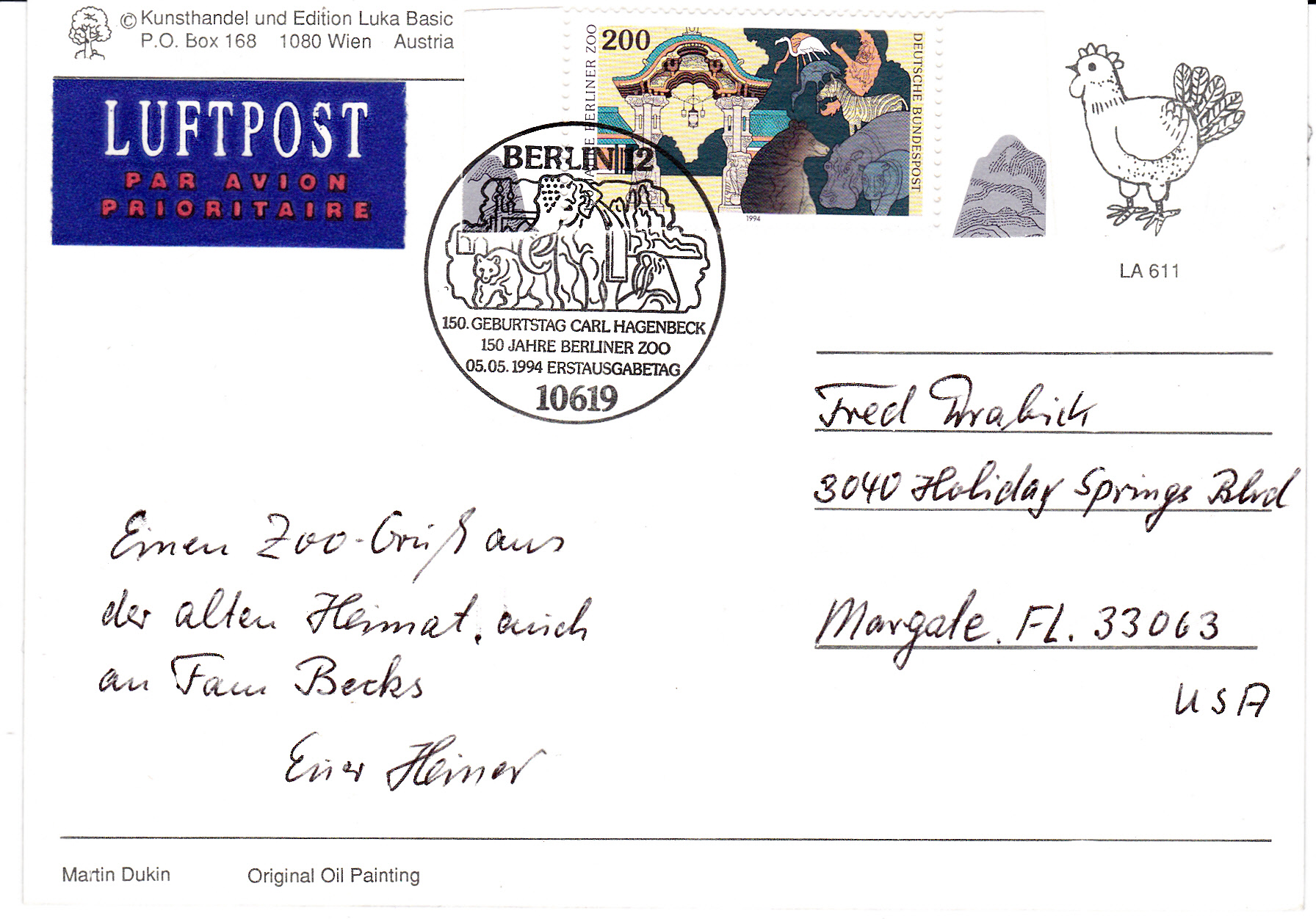Marke zu 200 Pf (MiNr 1735) aus dem Block 28 portogerecht auf einer Postkarte in die USA mit Ersttagsonderstempel aus Berlin vom 5.5.1994 zur Ausgabe der Blockausgabe "150 Jahre Berliner Zoo und 150 Geburtstag Carl Hagenbeck". Auf der Marke sind Zootiere und der Eingang des Berliner Zoos abgebildet.