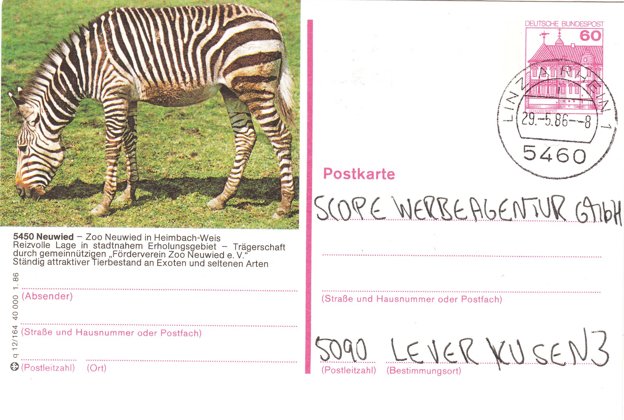 Dieser Maschinenwerbestempel aus Neuwied vom 4.7.1988 passt hervorragend zu der bereits gezeigten Bildpostkarte.