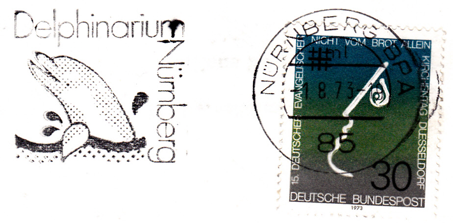 Der Nürnberger Tiergarten eröffnete 1971 ein Delfinarium, das einzige in Deutschland neben dem im Zoo Duisburg. Dieser Maschinenwerbestempel vom 1.8.1973 macht Werbung für das Delfinarium im Nürnberger Tiergarten.