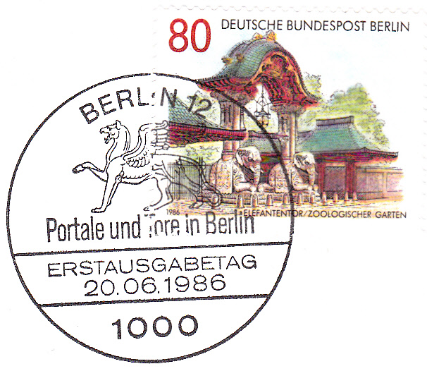 Die hier im ersten Beitrag bereits von Matthias gezeigte Marke aus Berlin mit dem Motiv "Elefantentor, Zoologischer Garten" (MiNr 763) wurde hier auf einem gelaufenen Brief am Ersttag mit dem dazu passenden Ersttagsonderstempel in Berlin gestempelt.