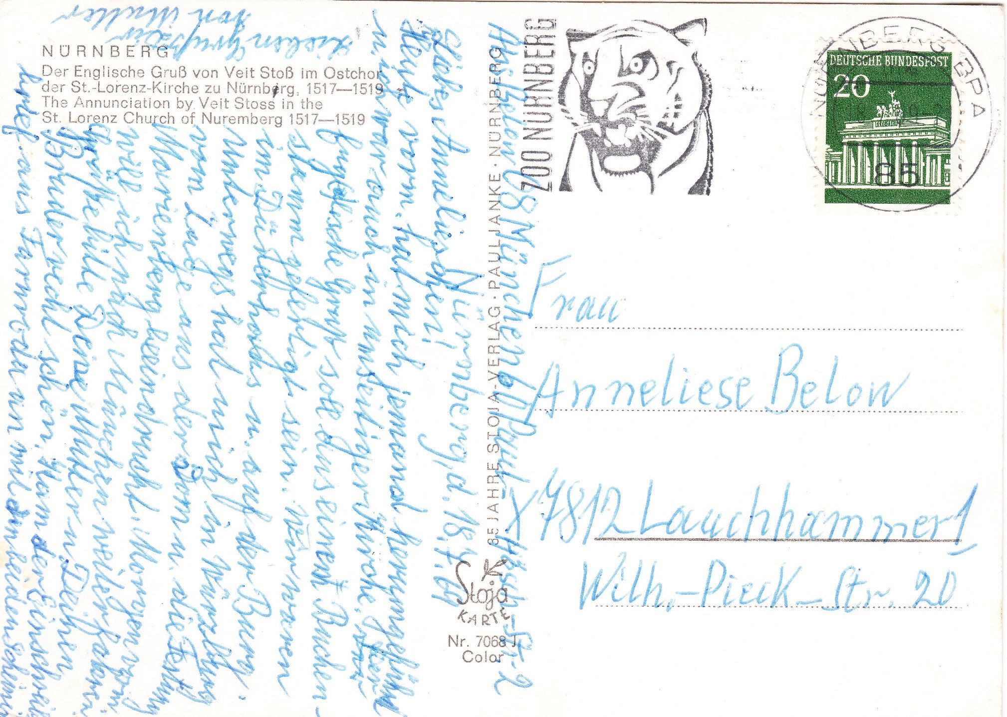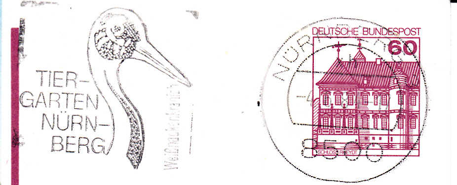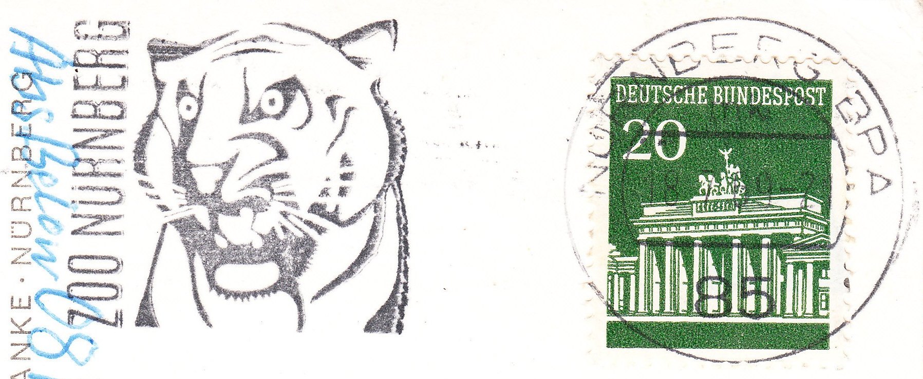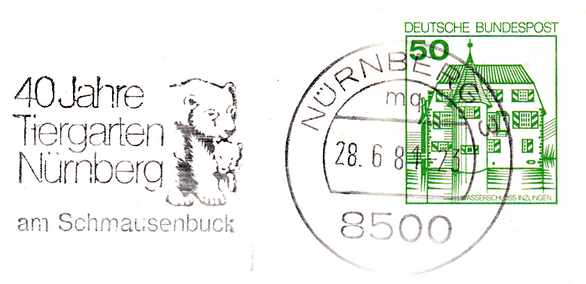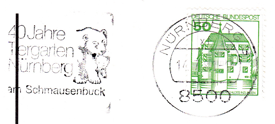Maschinenwerbestempel aus Nürnberg 3 vom 4.5.1982 oder 1983 mit dem Text "70 Jahre Tiergarten Nürnberg" und der Abbildung einer Seekuh. Da ist der Tiergarten aber innerhalb kurzer Zeit um 30 Jahre gealtert! Wie kann dies sein???