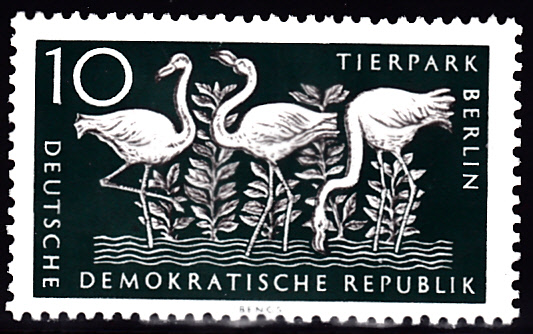 Auf der Marke zu 20Pf (MiNr 552) sehen wir Rosaflamingos (Phoenicopterus ruber roseus).
