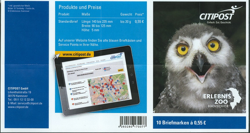 In der DBZ/14 wird berichtet, dass die CitiPost Hannover selbstklebende Marken mit Tier-Motiven zum Thema "ZOO Hannover" herausbrachte. Es werden in der DBZ die Werte zu Euro 1,40 und 2,20 gezeigt.