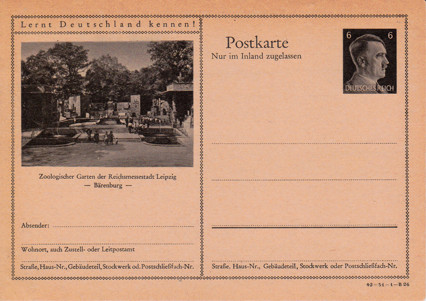 Der Leipziger Zoo wirbt 1942 auf dieser Karte (Serie 31 Bild 26) wieder mit einem etwas anderen Foto mit der Bärenburg.
