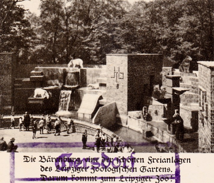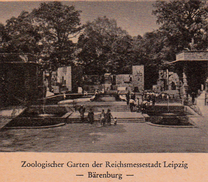 Auf dieser Bildpostkarte aus dem Jahre 1936 (MiNr P 236; Serie 77 Bild 9) wirbt der Zoologische Garten Leipzig mit einem Foto der "Bärenburg) zum Besuch des Zoos.