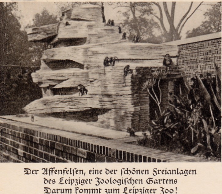 Der Leipziger Zoo wirbt 1937 auf dieser Karte (Serie 84 Bild 9) mit einem Foto mit dem Affenfelsen für einen Besuch im Zoologischen Garten Leipzig.