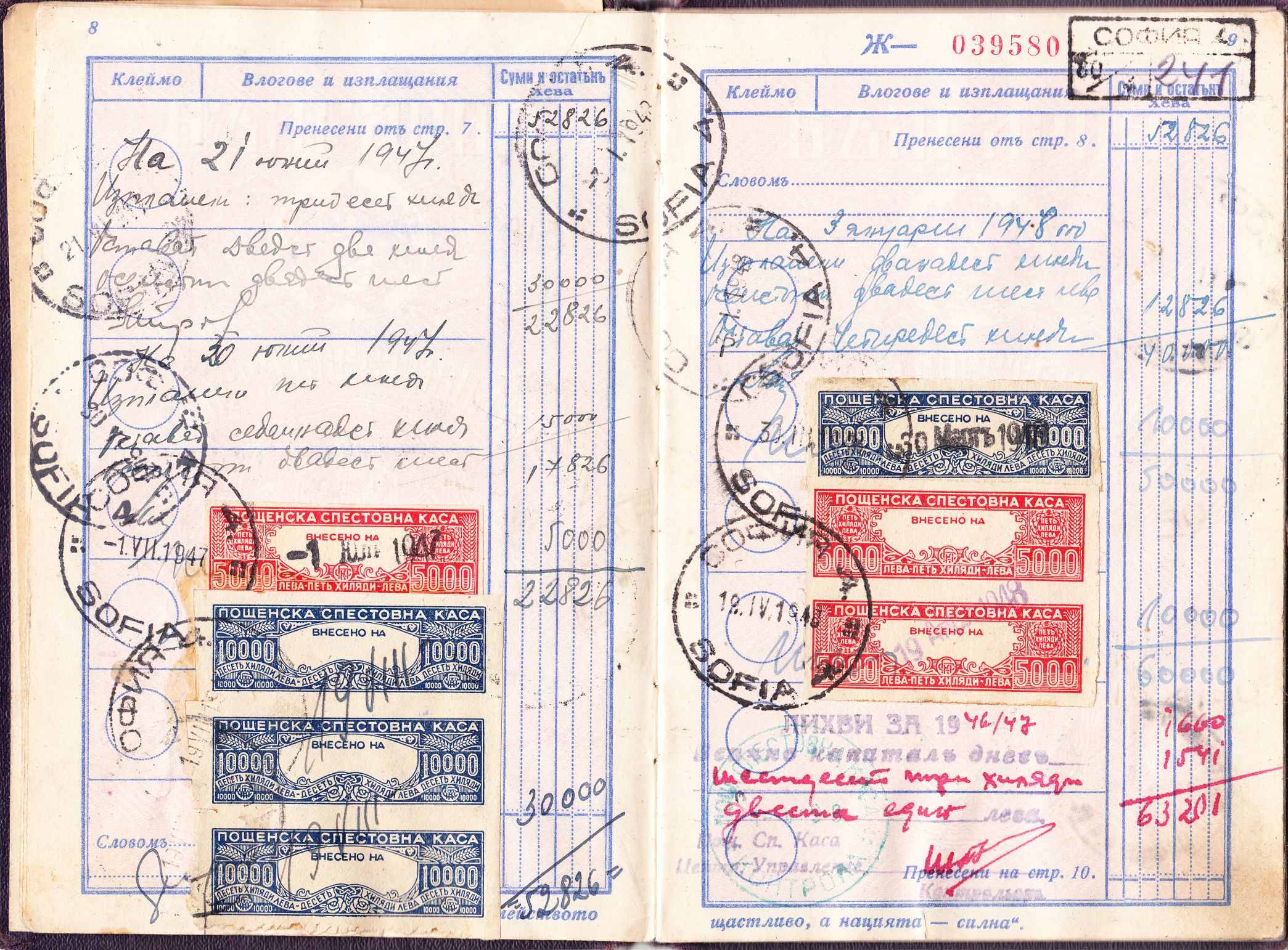 Oben auf der Seite 8 wurden zwei Auszahlungen dokumentiert, einmal 30.000 Leva sowie einmal 15.000 Leva, bevor es am 01.07.1947 zu einer Einzahlung von 5.000 Leva sowie am 19.08.1947 von 30.000 Leva kam. Im Gegensatz zu den 1943 verwendeten Marken, die gezähnt waren, wurden 1947 ungezähnte Marken verklebt.