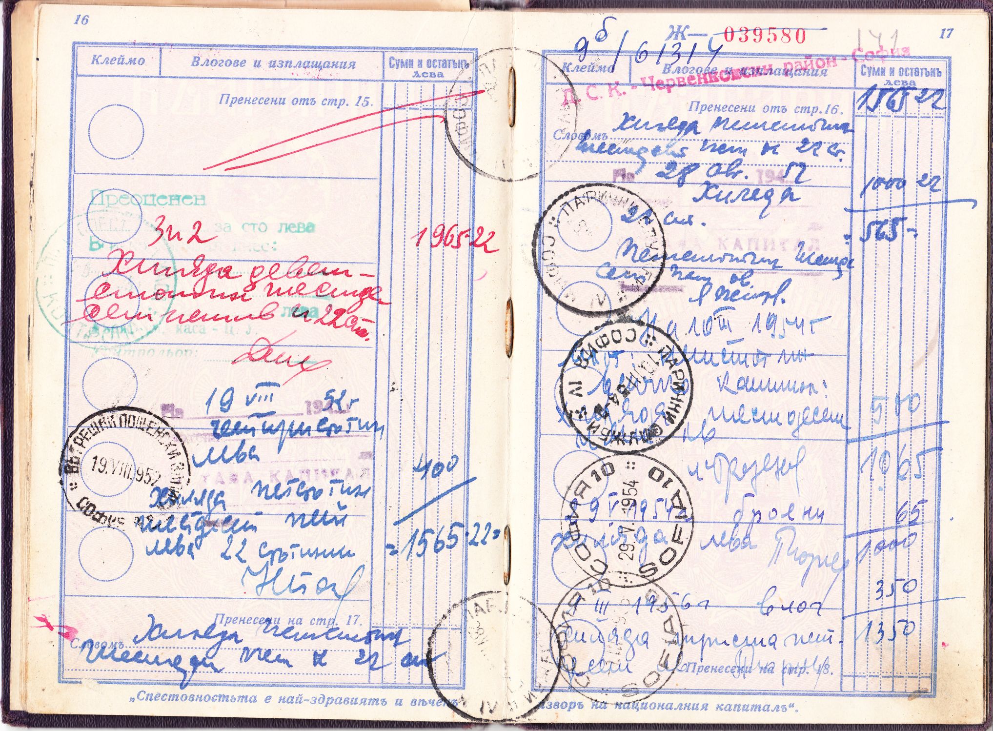 Bei diesem Sparbuch wurden aus dem auf Seite 15 ausgewiesenen Betrag von "73.261" alten Leva durch diese Umstellung dann die auf Seite 16 vermerkten "1965,22" Lew in der neuen Währung.