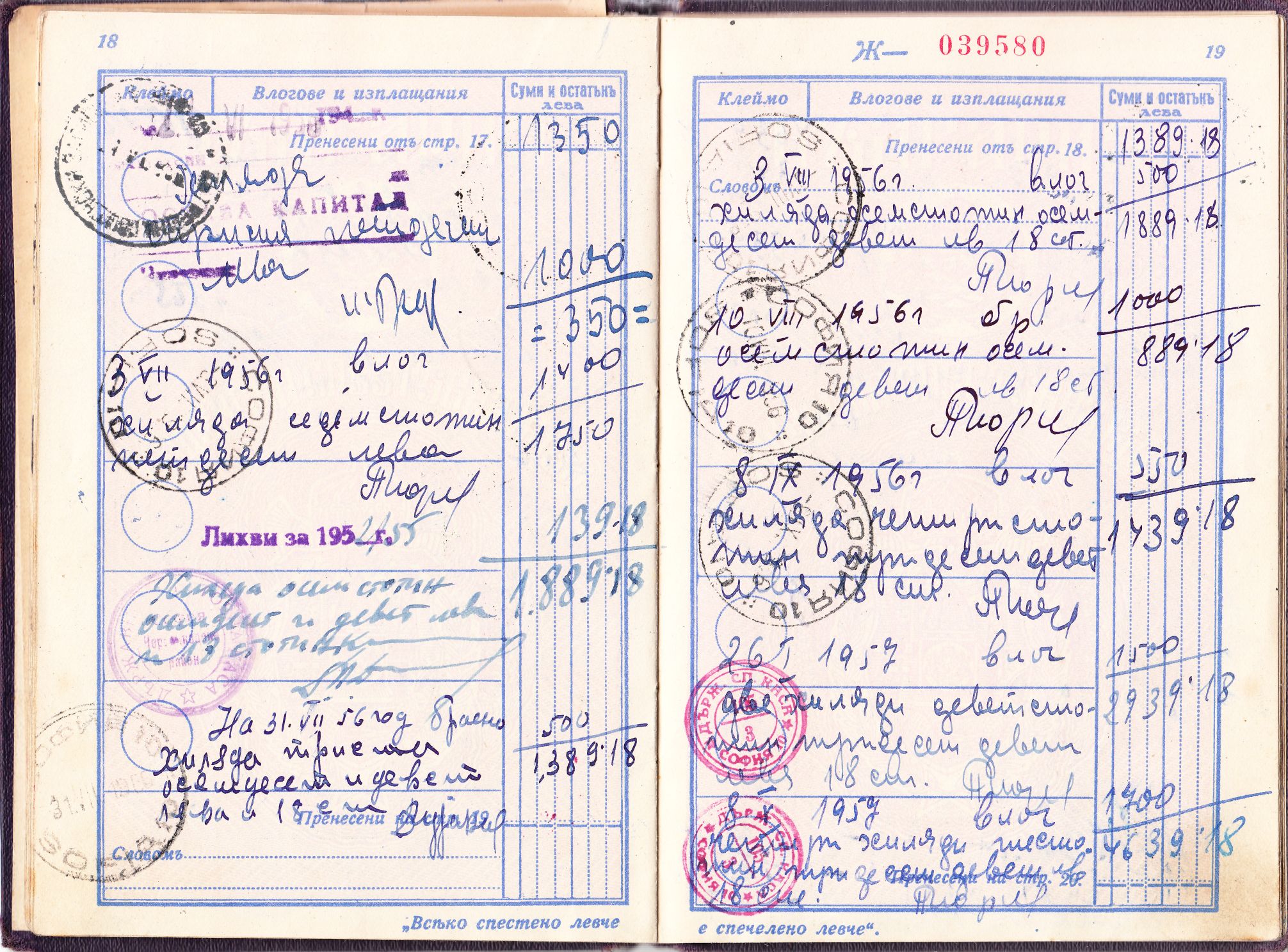 Am selben Tag wurden 40.000 Leva eingezahlt. Interessant ist, dass die Einzahlung auf der Seite 5 durch entsprechende Marken der Postsparkasse mit Inschrift "Пощенска спестовна каса" dokumentiert wurde, wobei eine Marke der Wertstufe zu 10.000 Leva sowie 6 Marken der Wertstufe zu 5.000 Leva verwendet wurden.