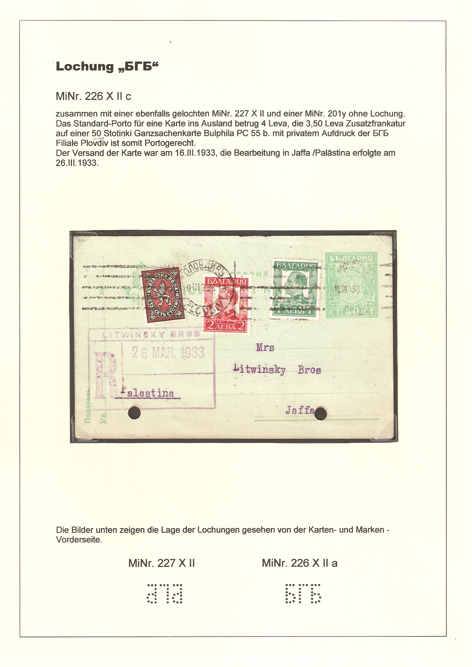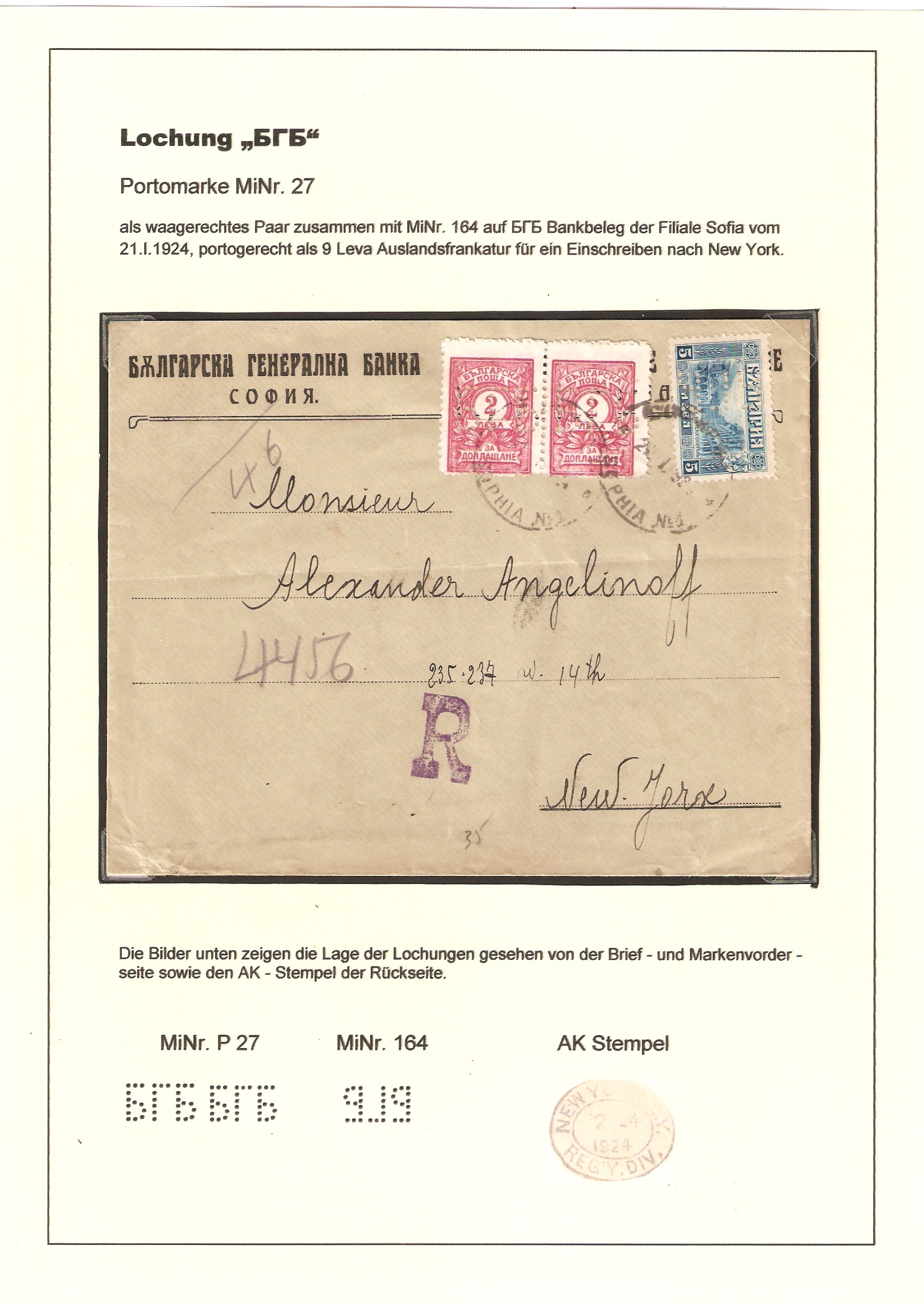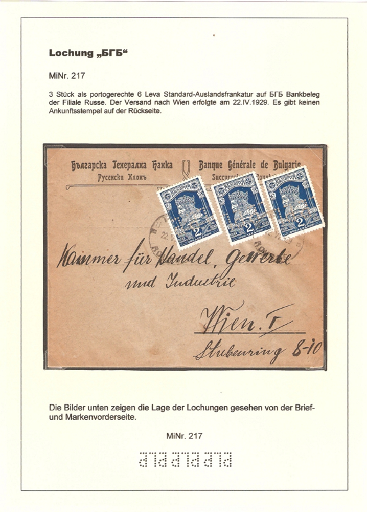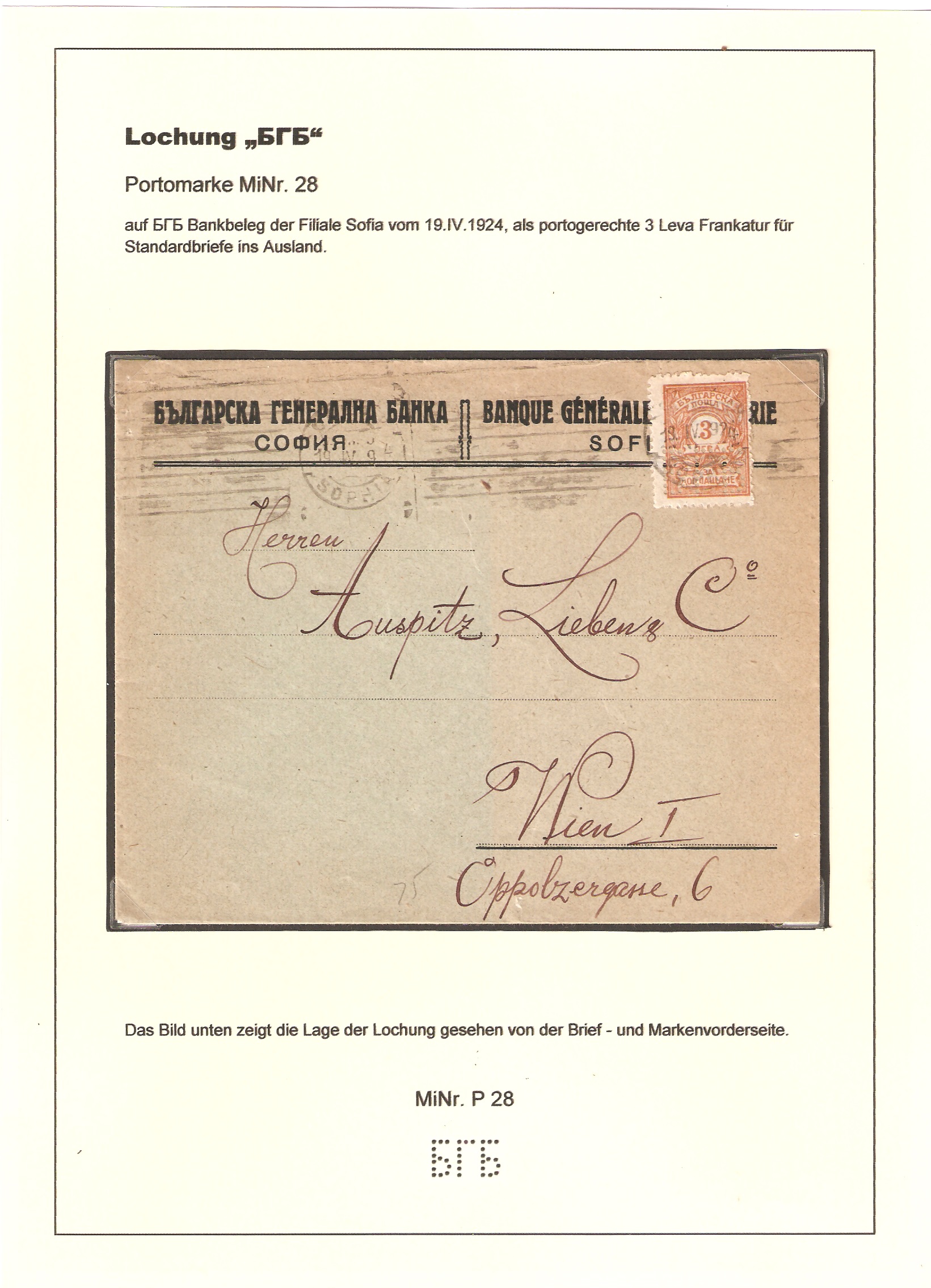 die perfekte Lochung der Marke auf dem hier gezeigten Beleg vom 19.IV.1924 deutet sehr auf die zwischenzeitliche Reparatur der Lochungsmaschine in der sofioter Filiale hin. (Standardporto für Briefe bis 20 Gr. = 3 Leva.)