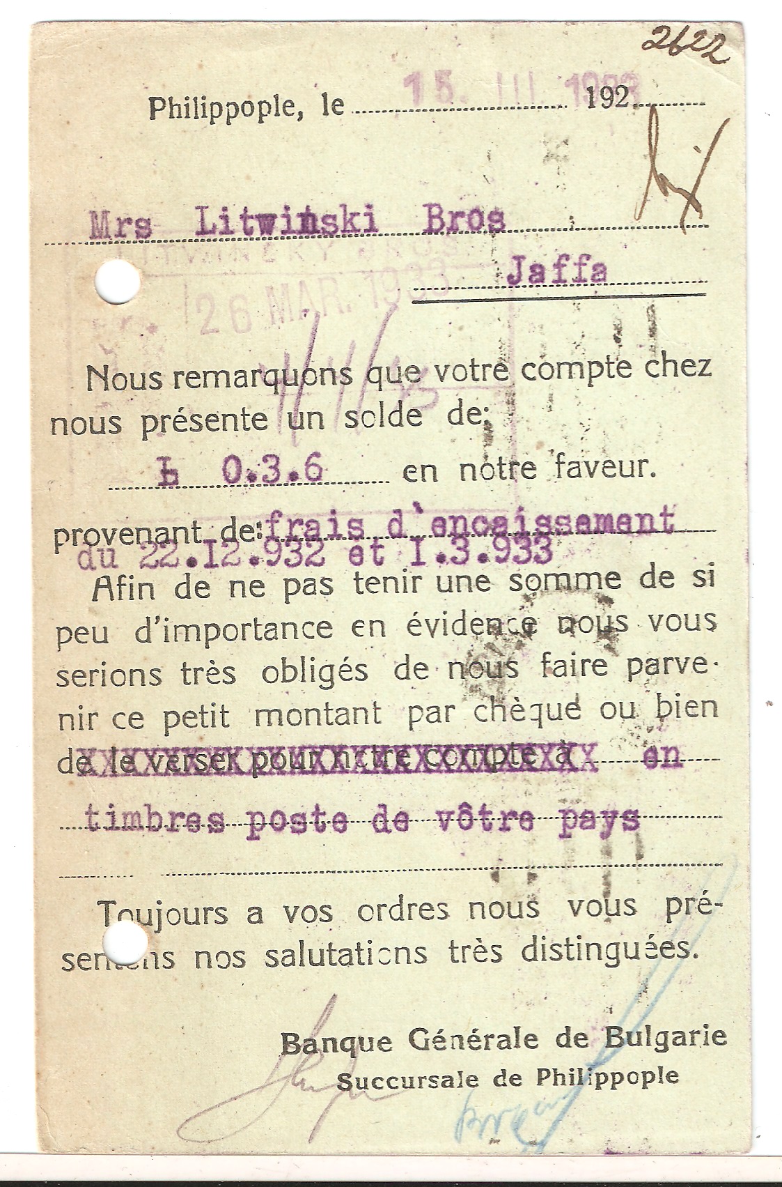 als zweites gibts heute eine Ganzsachen-Karte von der recht selten vorkommenden БГБ Filiale Plovdiv nach Jaffa.