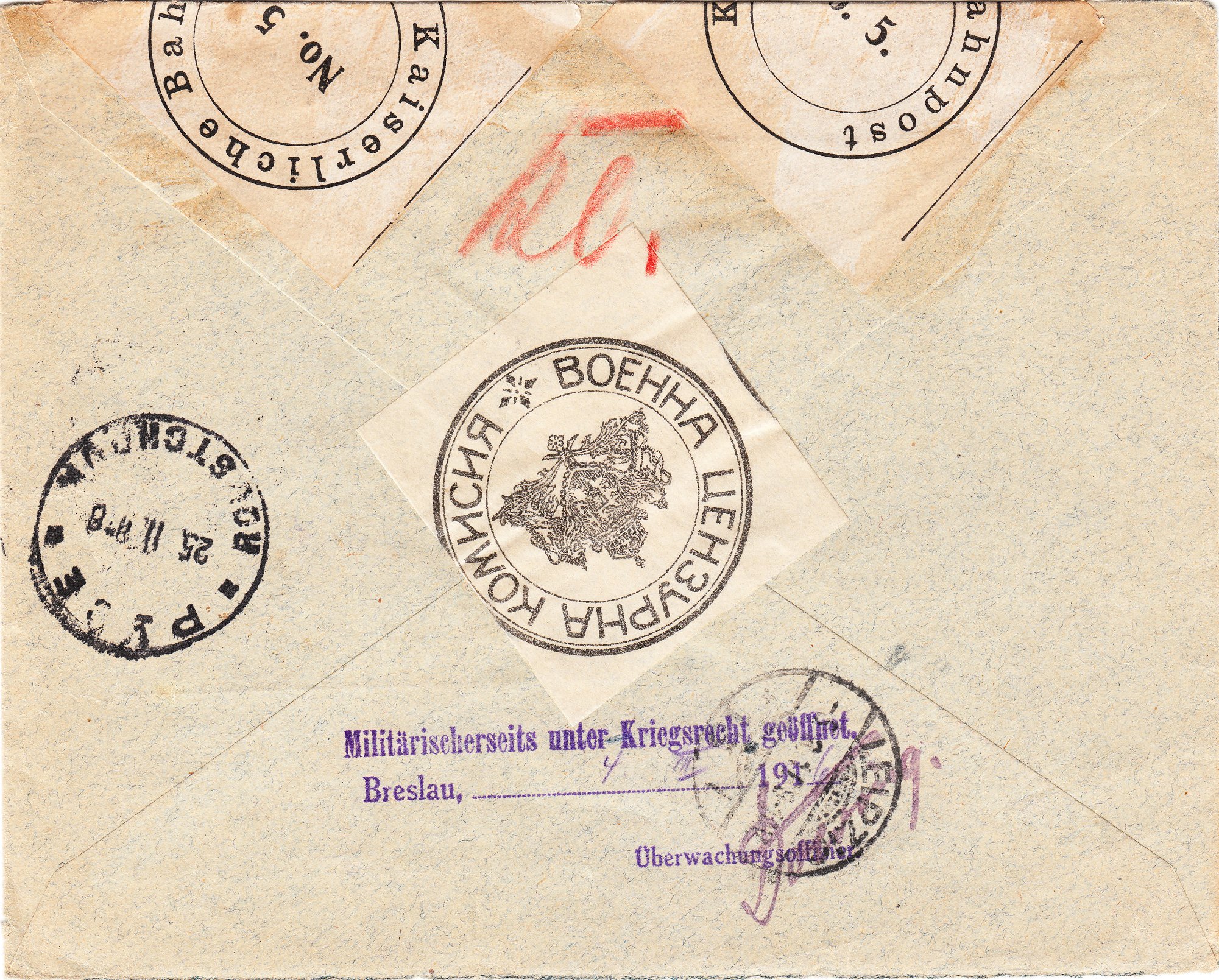 Der Beleg wurde in Breslau laut rückseitigem violettem Stempel oben "Militärischerseits unter Kriegsrecht geöffnet. Breslau 13.5.1918 Überwachungsoffizier" und mit einem Klebezettel "Kaiserliche Bahnpost No. 5." wieder verschlossen. Das in Breslau stationierte Bahnpostamt No. 5 war zuständig für die nach Deutschland führende Bahnstrecke Oderberg-Breslau des Balkanzugs.