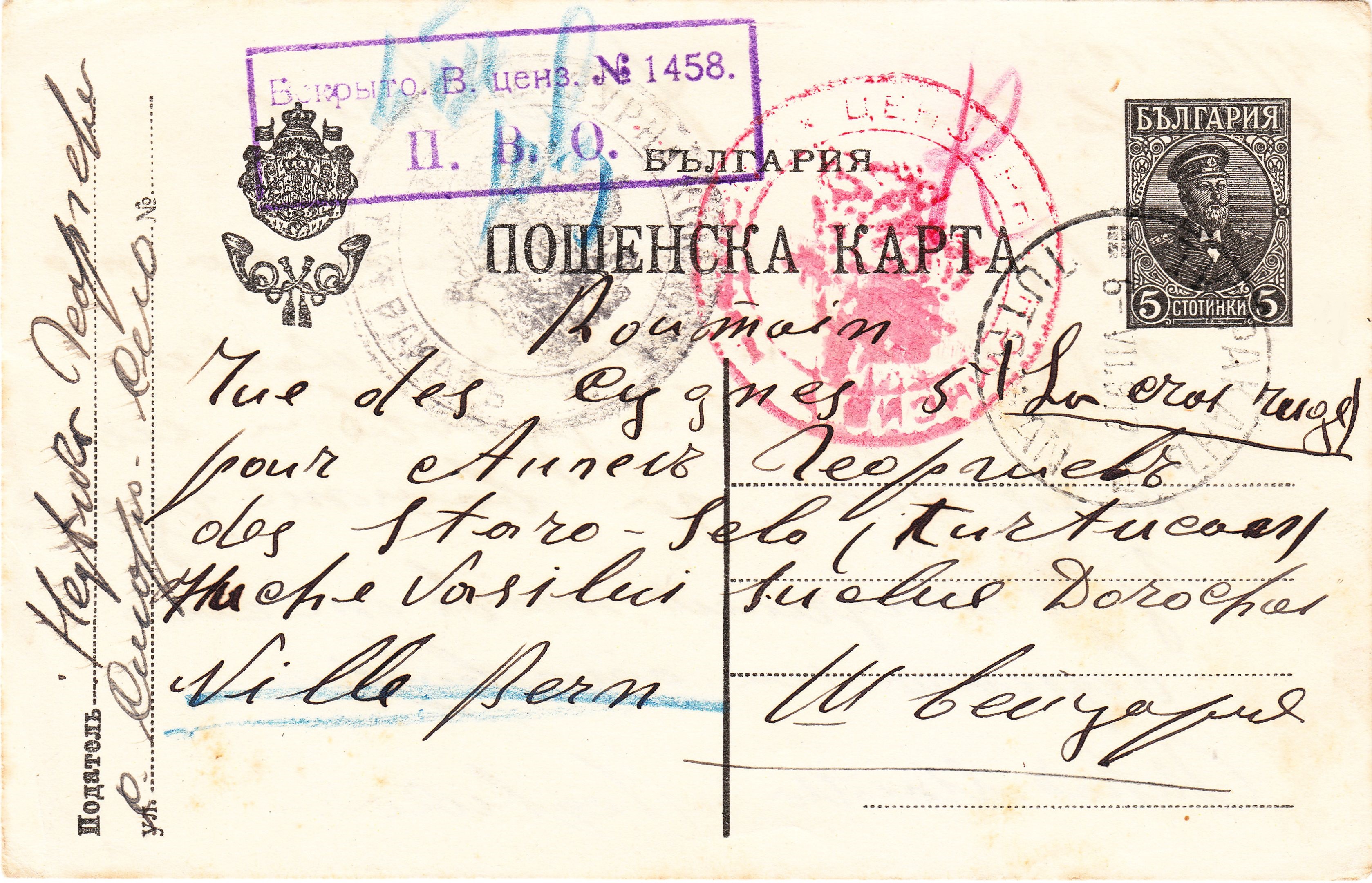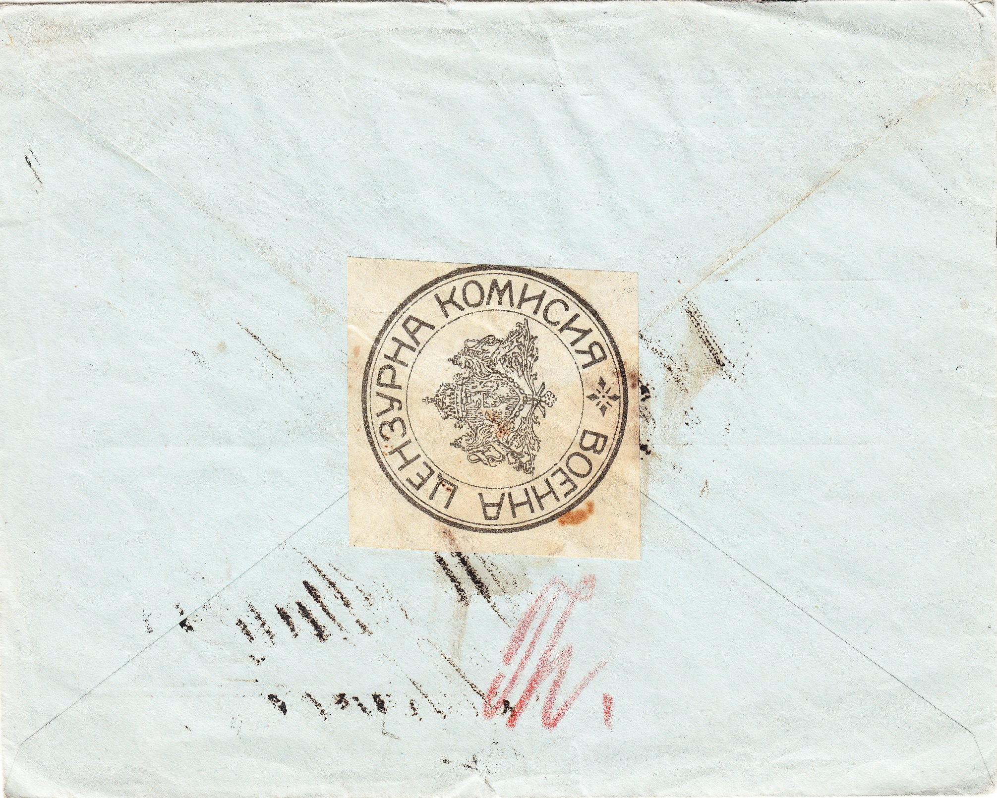 In Bulgarien wurde der Beleg von der "военна цензура комисия = Militär Zensur Kommission" in Sofia zensiert und mit einem Verschlußzettel sowie einem Prüfstempel in Rot versehen: