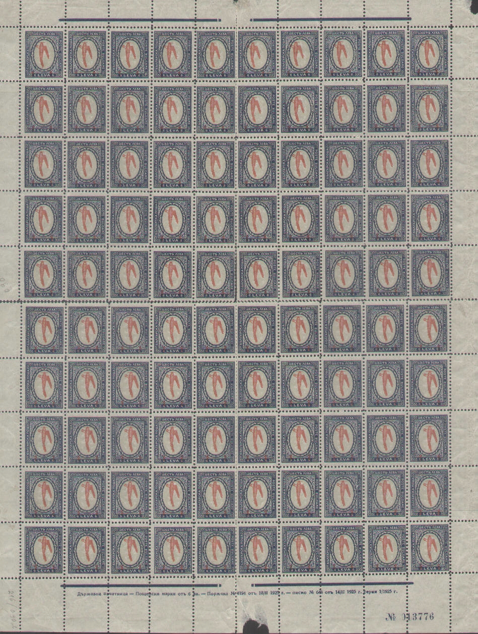 Zahl der gedruckten Bögen: 250Randinschrift: Staatsdruckerei – Postwertzeichen zu 6 Lv.. – Auftrag No. 4194 vom 18.II.1925 – Brief No. 648 vom 14.II.1925 - Serie I – 1925. Bogennummer 013776.