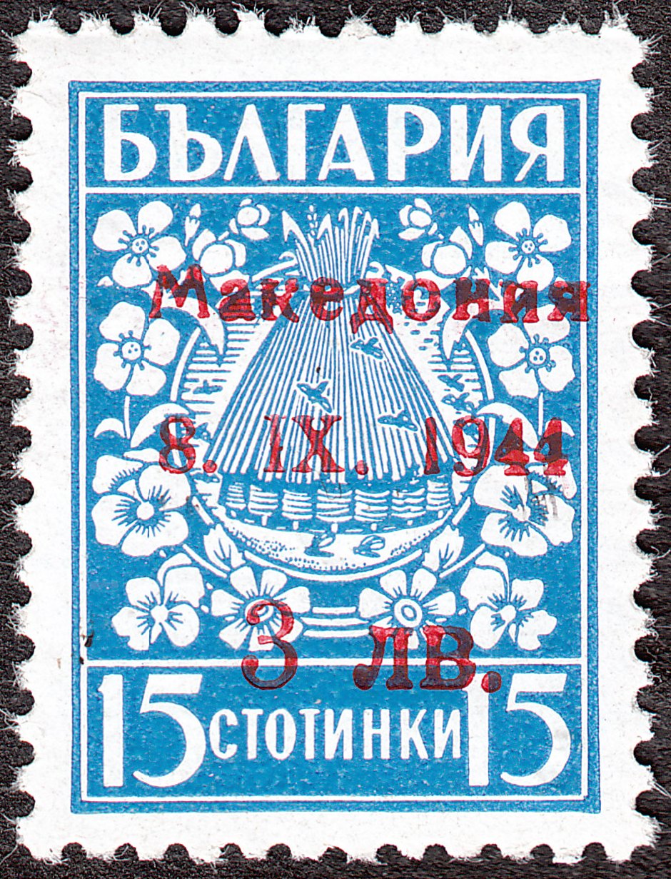 Die Freimarke Bulgarien MiNr. 408 x wurde am 30.10.1944 mit dunkelrosarotem Aufdruck "Македония 8. IX. 1944 3 ЛB." versehen ausgegeben und als MiNr. 2 II katalogisiert:
