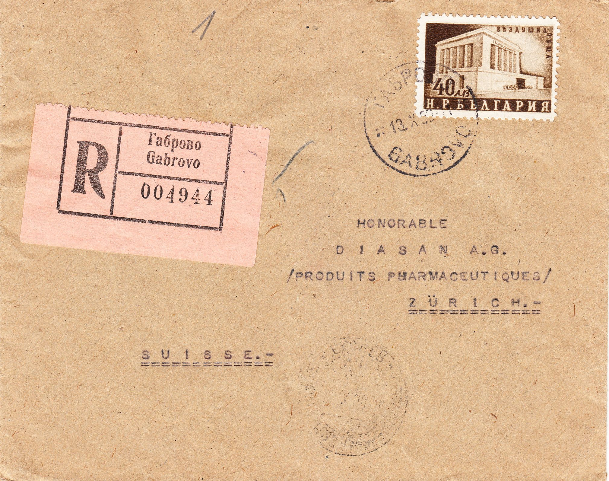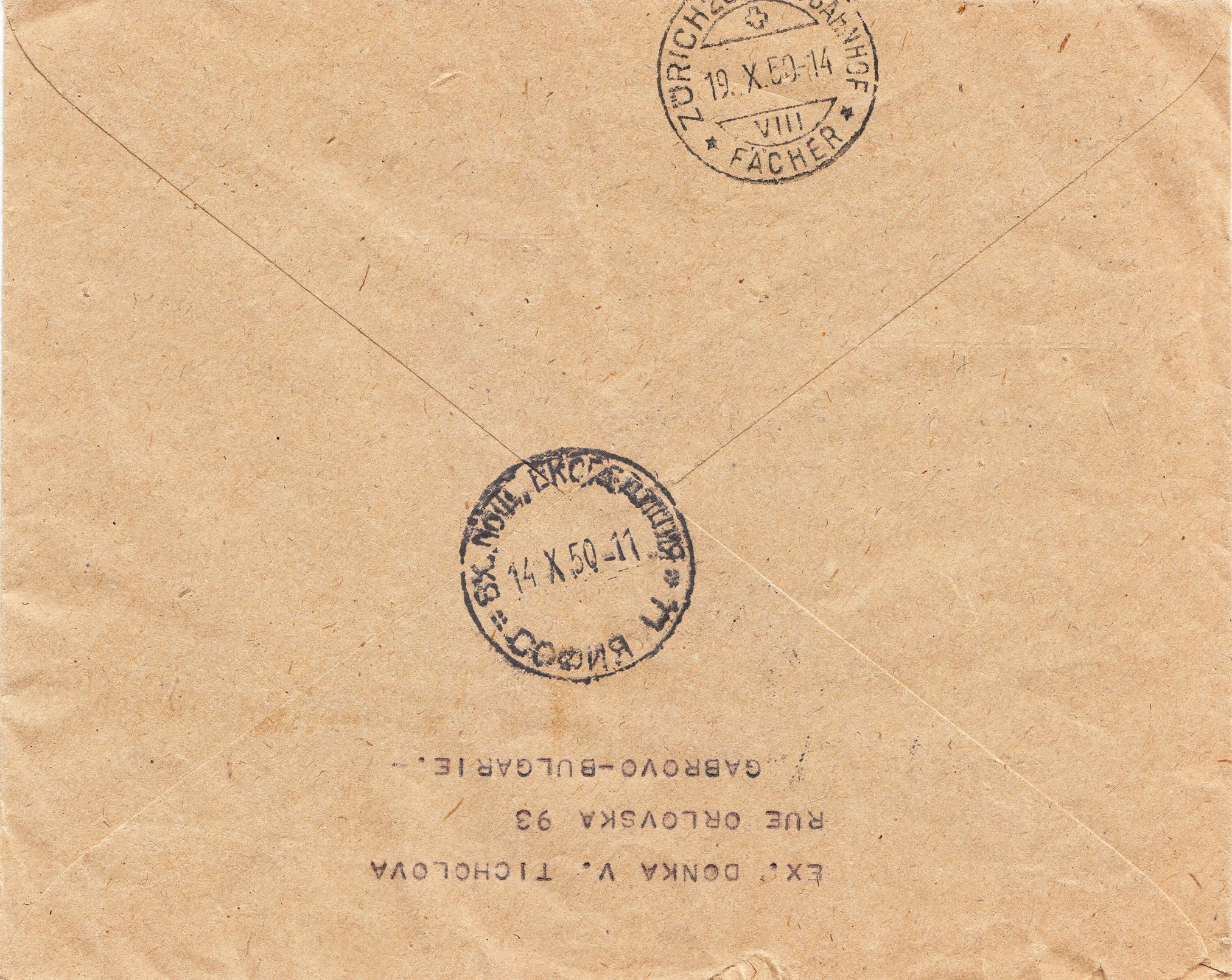 Rückseitig finden sich ein Durchgangsstempel vom 14.10.1950 aus Sofia sowie ein Ankunftsstempel vom 19.10.1950 aus Zürich: