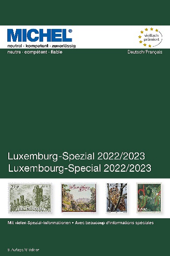Der Michel Luxemburg/Luxembourg 2019 ist am 4.11.2022 in der 8. Auflage in Farbe mit 216 Seiten im Format 150 x 225 mm als Paperback erschienen. Der Katalog ist zweisprachig: Deutsch (Text in Schwarz) und Französisch (in Blau). Er kostet in Papierform 36,00 € und in der MICHEL-Online-Bibliothek 19,00 €.
