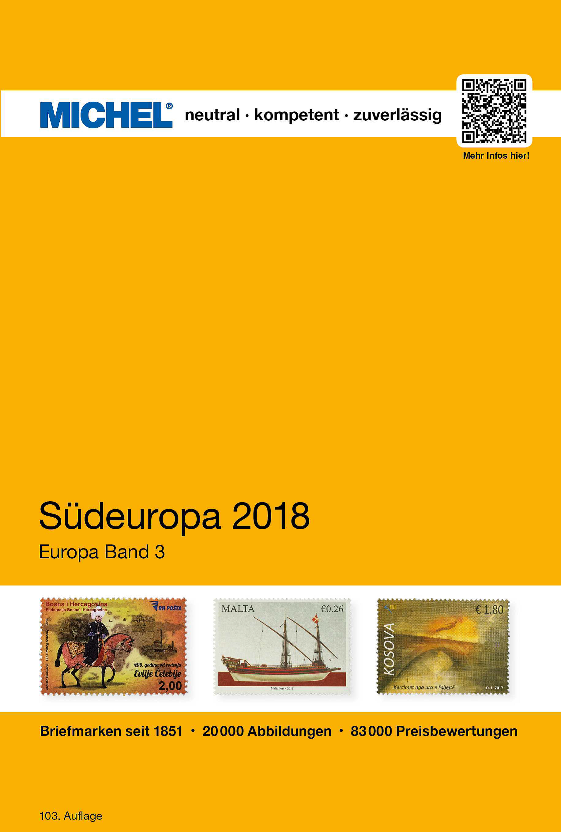 Am 6. Juli 2018 erscheint der Südeuropa-Katalog 2018 (EK 3) in der 103. Auflage in Farbe. Er hat 1568 Seiten im Format: 155 x 230 mm und erscheint im Festeinband mit Lesebändchen. Er enthält die Markenausgaben folgender Länder: Albanien, Bosnien und Herzegowina (alle 3 Postverwaltungen), Fiume, Italien, Jugoslawien, Kosovo, Kroatien, Makedonien, Malta, Montenegro, San Marino, Serbien, Slowenien, Triest, Vatikan. Er kostet in der Papierversion 72,00 € und als E-Book in der Online-Bibliothek 49,00 € .