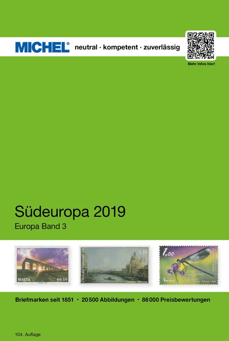 Am 23. August 2019 erschien der Südeuropa-Katalog 2018 (EK 3) in der 104. Auflage in Farbe. Er hat 1632 Seiten im Format: 155 x 230 mm und erschien im Festeinband mit Lesebändchen. Er enthält die Markenausgaben folgender Länder: Albanien, Bosnien und Herzegowina (alle 3 Postverwaltungen), Fiume, Italien, Jugoslawien, Kosovo, Kroatien, Makedonien, Malta, Montenegro, San Marino, Serbien, Slowenien, Triest, Vatikan. Er kostet in der Papierversion 74,00 € und als E-Book in der Online-Bibliothek 49,00 € .