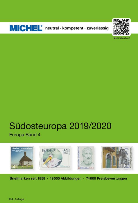 Am 27. September 2019 erscheint der neue Michel Südosteuropa 2019/2020 (EK 4) in der 104. Auflage in Farbe. Er hat 1376 Seiten im Format 155 x 230mm und erscheint im Hardcover mit Lesebändchen. Er enthält die Markenausgaben folgender Länder: Ägäische Inseln, Bulgarien, Epirus, Griechenland (mit Mönchsrepublik Athos), Ikarien, Ionische Inseln, Kreta, Ostrumelien, Rumänien, Samos, Thrakien, Türkei, Türkisch-Zypern und Zypern. Er kostet in der Papierversion 74,00 € und in der MICHEL-Online-Bibliothek 49,00 €.