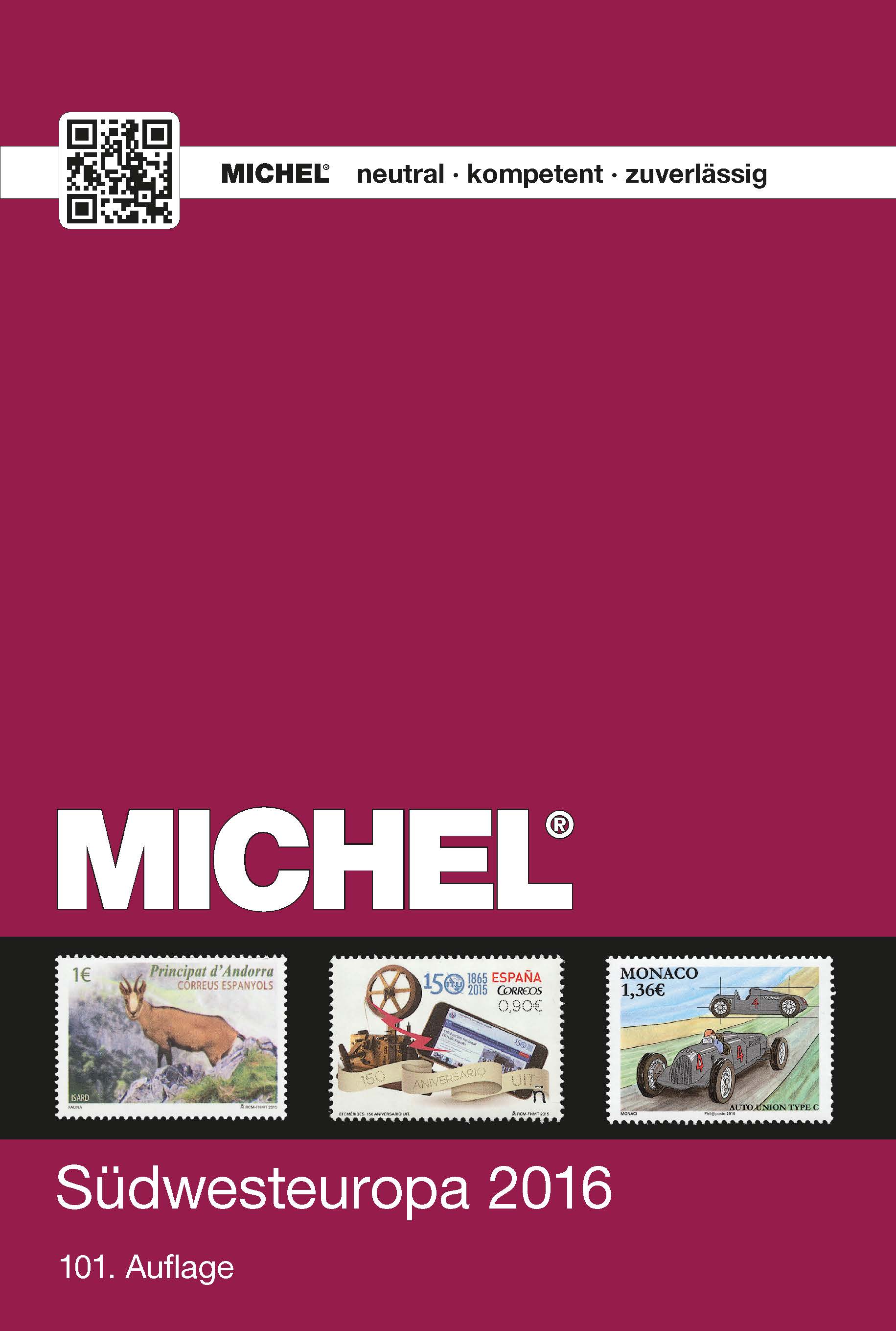 Am 6. Mai 2016 ist der neue Michel Südwesteuropa 2016 (EK 2) in der 101. Auflage in Farbe mit ca 1504 Seiten im Format 155 mm x 230 mm als Hardcover erschienen. Er kostet in Papierversion als Katalog 68,00 € und in der MICHEL-Online-Bibliothek 34,00 €. Er enthält die Länder Andorra (franz.), Andorra (span.), Frankreich, Gibraltar, Monaco, Portugal und Spanien.