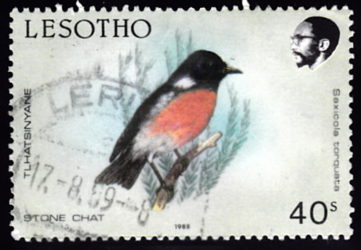 Auf dieser Marke aus Lesotho (MiNr 686)n wird ein Afrikanisches Schwarzkehlchen (Saxicola torquatus) gezeigt.