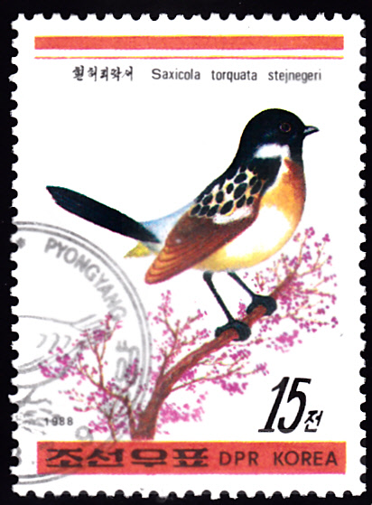 Hier eine Marke aus Nord-Korea (MiNr 2933) mit einem Stejnegers Schwarzkehlchen (Saxicola stejnegeri). Im Michel wird es Sibirien-Schwarzkehlchen (Saxicola torquata stejnegeri) genannt.