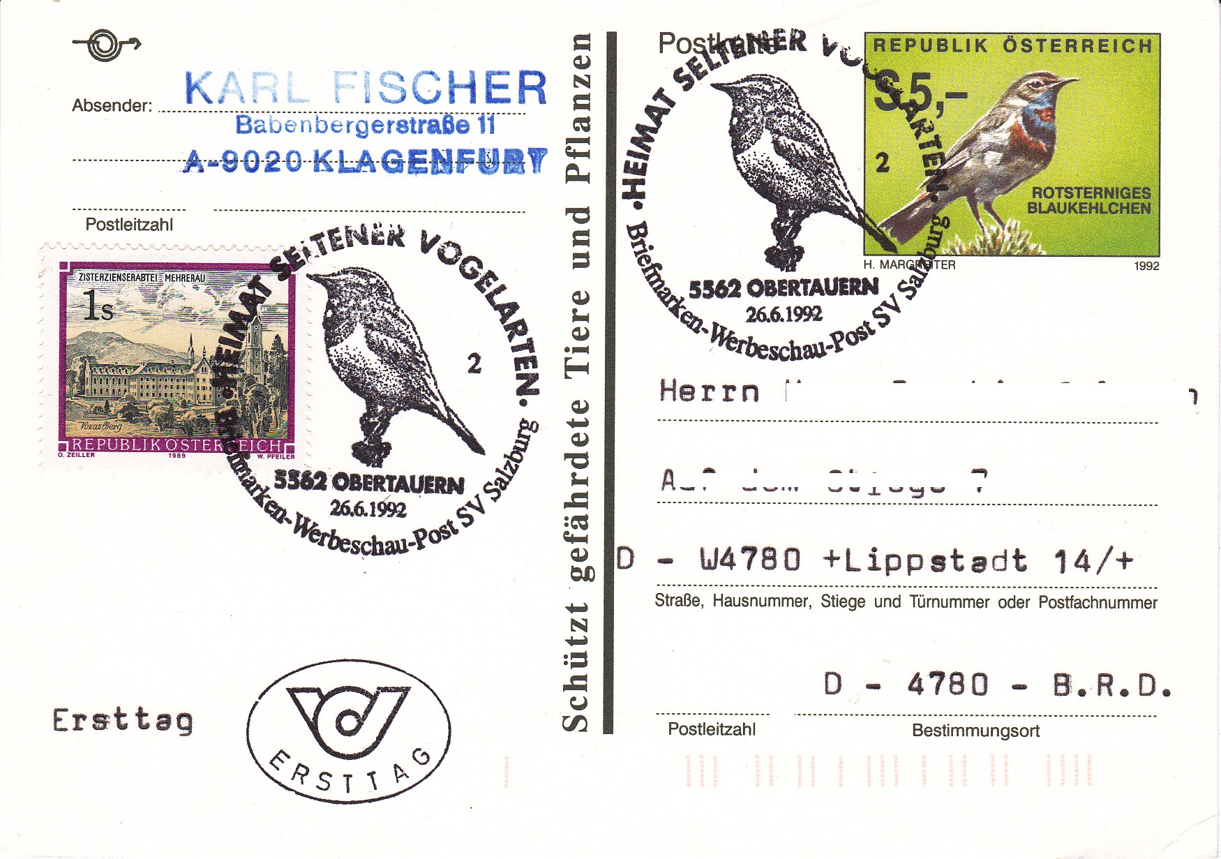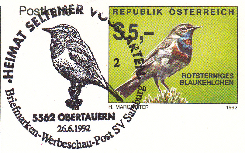 Zur bereits hier gezeigten österreichischen Postkarte mit dem Wertstempel Rotstern-Blaukehlchen (Luscinia svecica svecica) wurde in Obertauern am Ausgabetag der Ganzsache ein zum Wertstempel passender Sonderstempel mit der Abbildung eine Blaukehlchen geführt. Im Stempelbild ist natürlich keine Unterscheidung der beiden Unterarten möglich. Der hier gezeigte Stempel hat die Kennziffer "2".