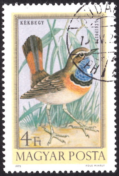 Aus Ungarn kommt diese Marke (MiNr 2861 A), die ebenfalls ein Weißstern-Blaukehlchen (Luscinia svecica cyanecula) zeigt.
