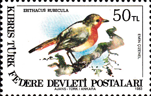 Ein weiteres Rotkehlchen (Erithacus rubecula) ist auf dieser Marke aus Türkisch-Zypern (MiNr 136) zu sehen.