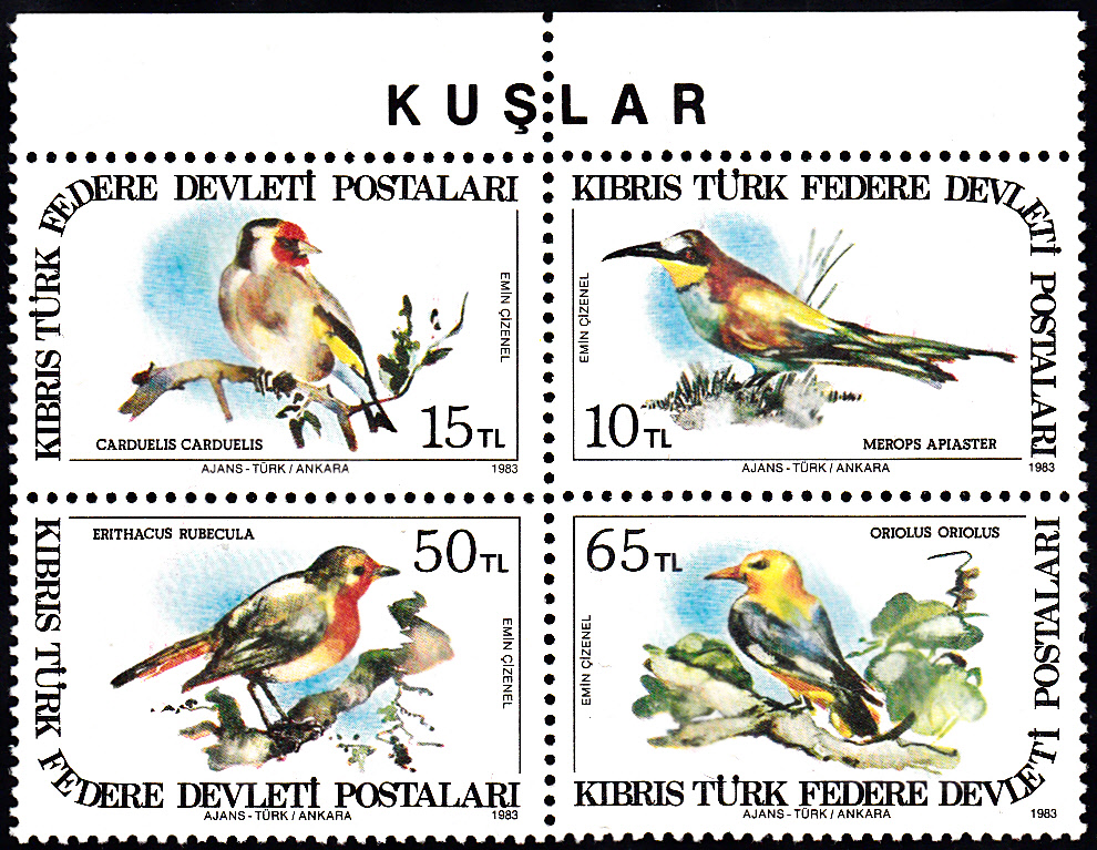 Diese Marke wurde mit drei weiteren Marken mit Vögel zusammenhängend als Viererblock gedruckt. Hier ein kompletter Viererblock: