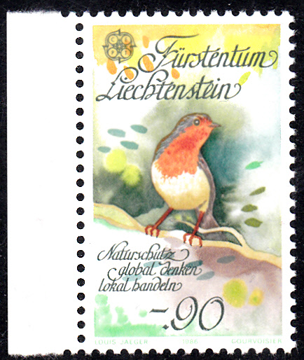 In Liechtenstein erschien die Europamarken 1986 zu 90 Rappen (MiNr 894) zum Gemeinschaftsthema "Natur- und Umweltschutz mit der Abbildung eines Rotkehlchen (Erithacus rubecula).
