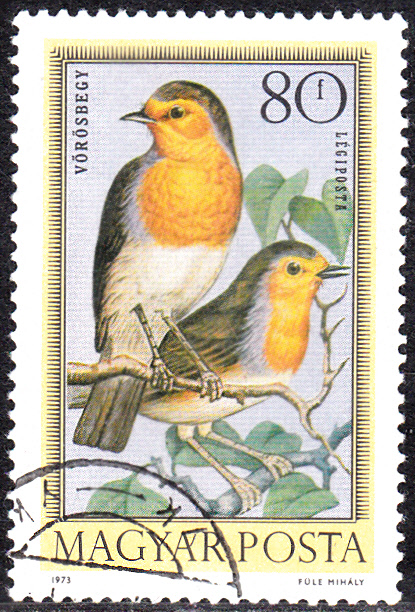 Auf dieser ungarischen Marke (MiNr 2857 A) werden zwei Rotkehlchen (Erithacus rubecula) gezeigt.