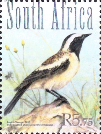 Auf einer Marke aus Südafrika (MiNr 1968) wird ein Fahlschulterschmätzer (Campicoloides bifasciata) gezeigt.